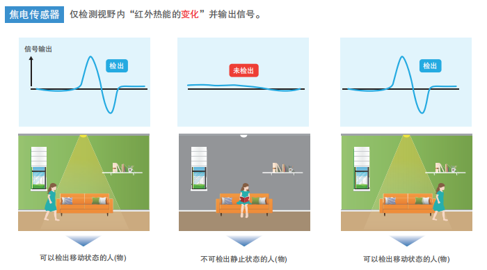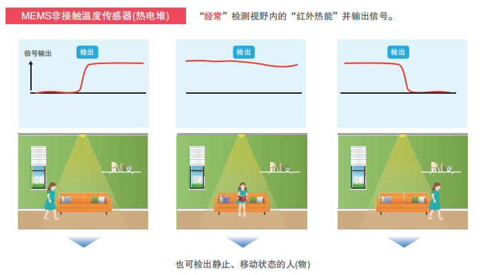焦電傳感器和MEMS非接觸溫度傳感器都是接收紅外線微弱的熱能并輸出信號(hào)的傳感器。焦電傳感器無法檢測(cè)靜止?fàn)顟B(tài)的人(物),而MEMS非接觸溫度傳感器可以檢測(cè)靜止?fàn)顟B(tài)的人(物)。