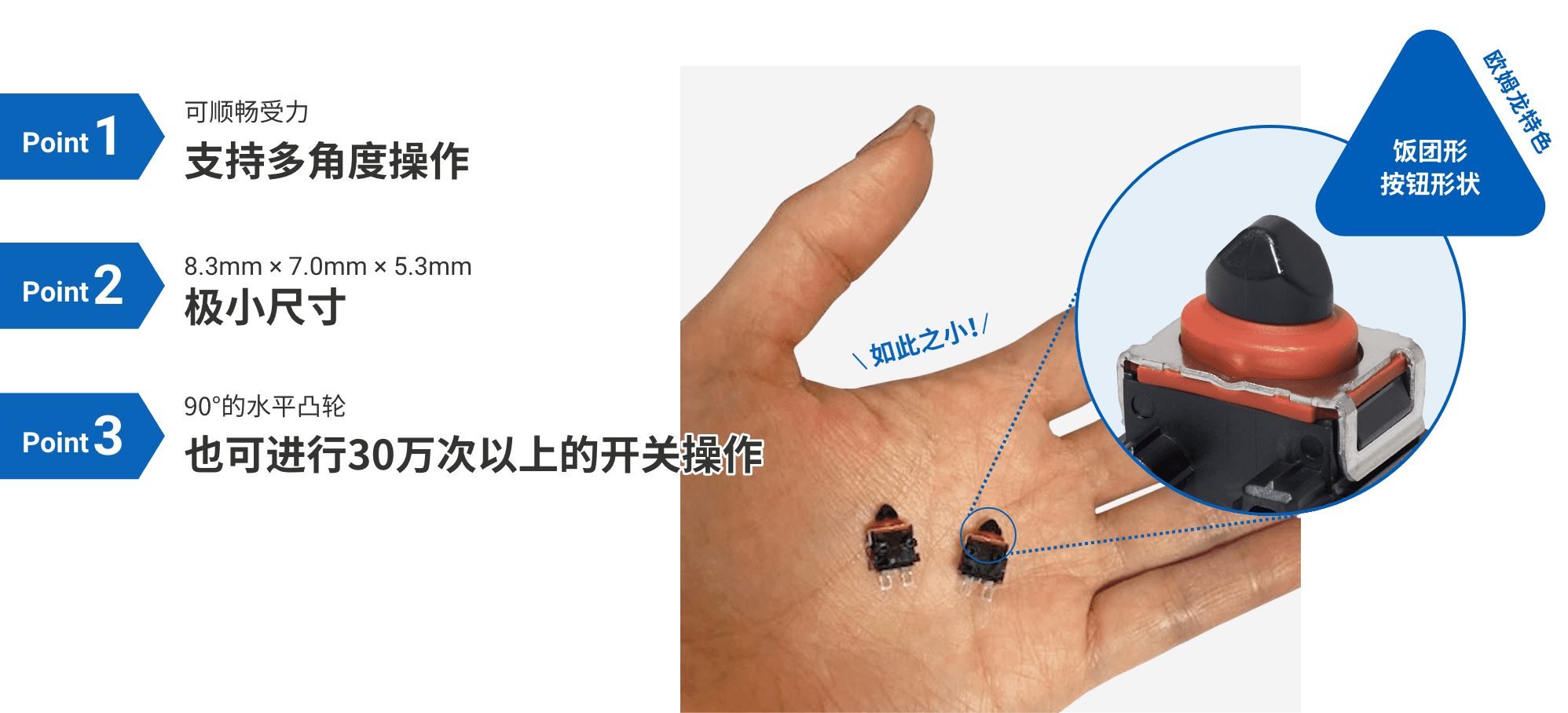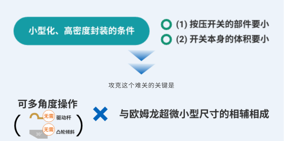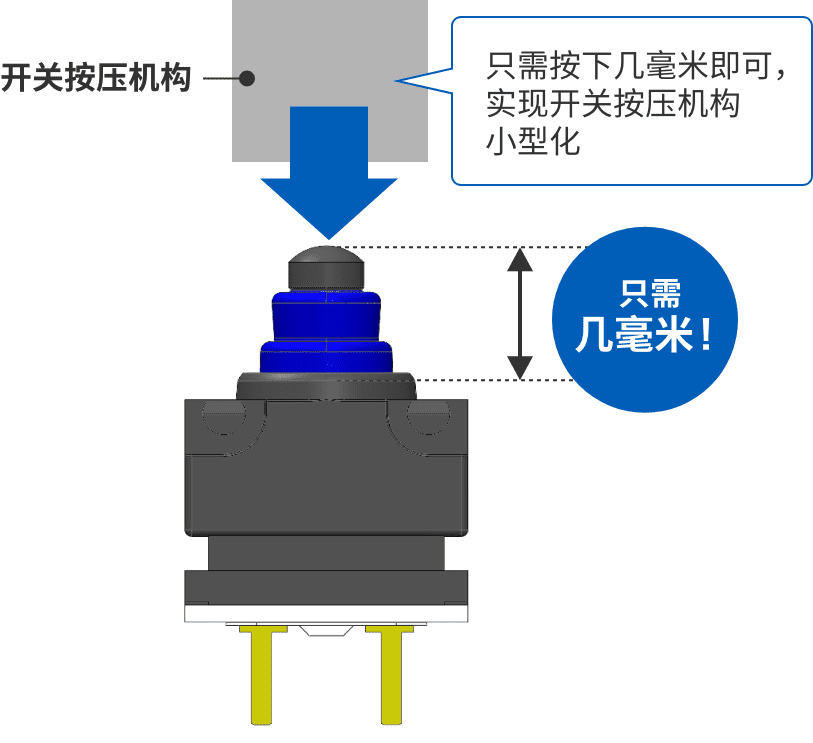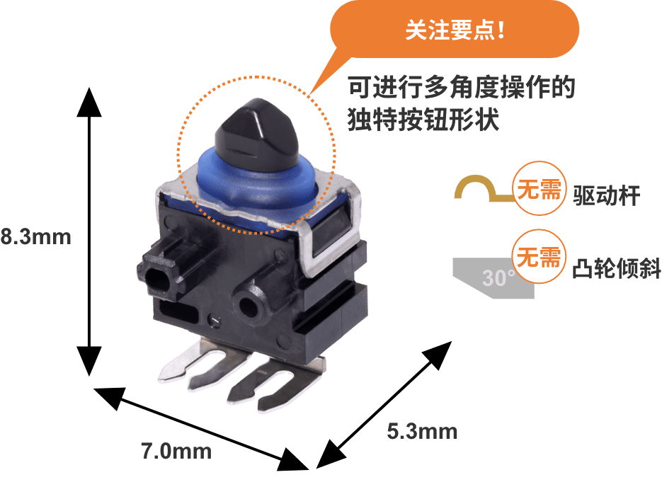 實現(1)和(2)最簡單的方法就是從正上方按壓,也就是從行程(完全按下開關的距離)最短的角度按壓。但要設計行程只有幾毫米的超微小型開關的垂直按壓并不容易。