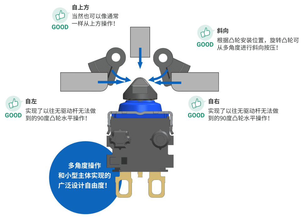 D2EW開關通過歐姆龍全新研發的獨特按鈕形狀,無需驅動桿、無需傾斜水平凸輪即可從水平方向進行操作。除了水平方向,還可從其他角度進行操作。(參照下圖)