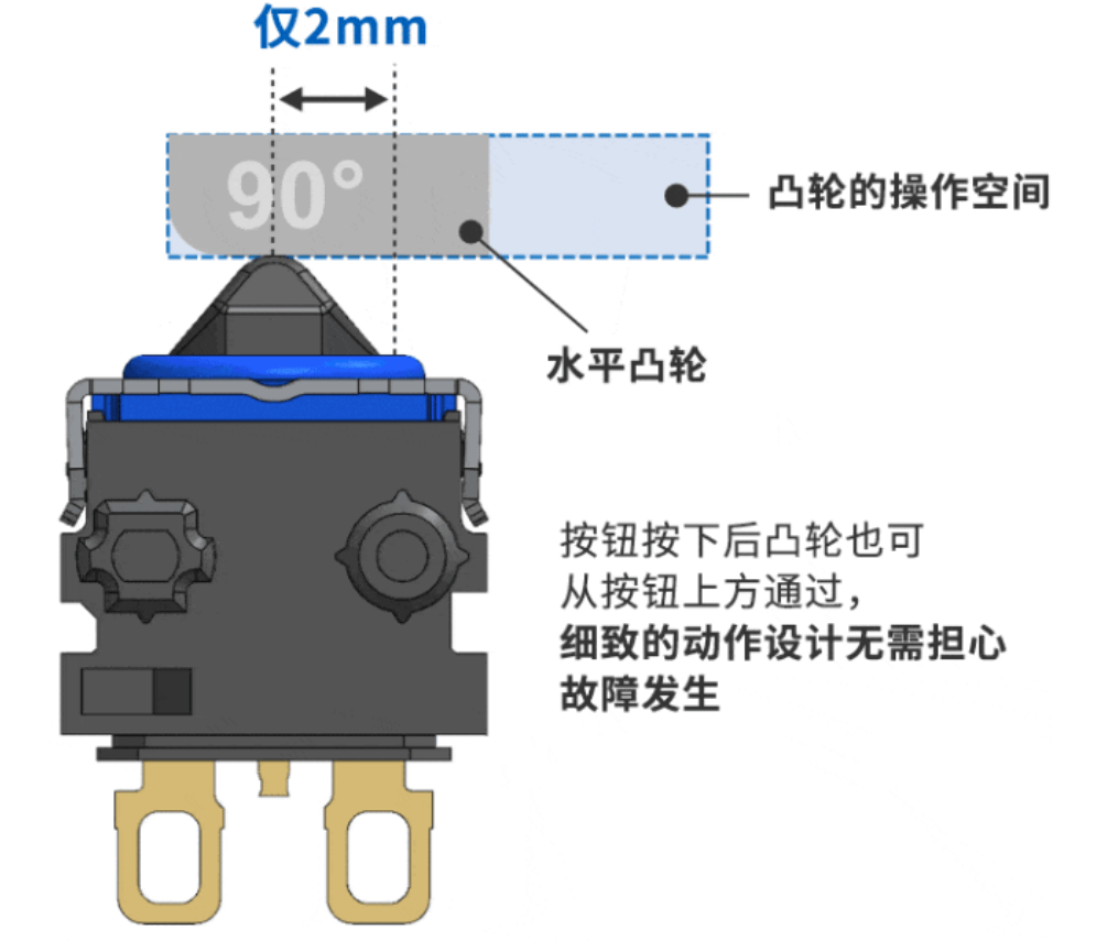 由于無驅動桿,水平凸輪只需最小的移動即可完全按下按鈕,因此有助于節省空間。
