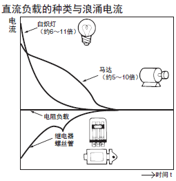 接不同負(fù)載的直流電路,電路中的浪涌值和電路中額定電流值的倍數(shù)關(guān)系如下圖: