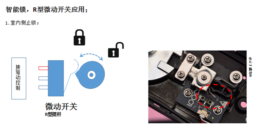 而微動開關(guān)在智能鎖中的作用不容小覷,它在智能鎖中主要用來檢測鎖舌的位置,告知目前門鎖的狀態(tài)——是開鎖狀態(tài)還是關(guān)鎖狀態(tài),從而向電機(jī)發(fā)送驅(qū)動信號,推動或拉回鎖桿。對于智能鎖而言,微動開關(guān)是至關(guān)重要的存在,若微動開關(guān)失效,那么整個鎖體將失靈,住戶安全將得不到保障。微動開關(guān)通常又分為直擺桿型和R型擺桿兩種類型。