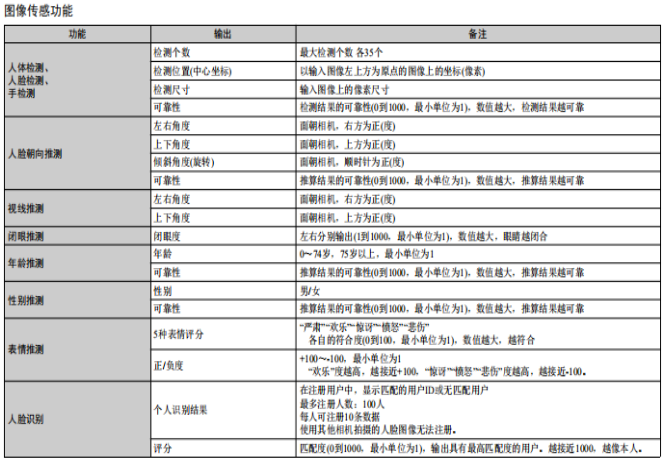 這款人體識別圖像傳感器視覺組件(HVC)是歐姆龍“OKAOTM Vision”圖像傳感技術的組合產品,可通過攝像頭模塊識別人體眨眼、視線方向、表情、性別或年齡。 其較大速率下的響應時間是第一代HVC-P的10倍。 此外,還有兩種鏡頭可供選擇,長距離50度型(B5T-007001-010)和廣角90度型(B5T-007001-020)。客戶可根據檢測距離和FOV(視場)做出選擇。“HVC-P2”能夠檢測和推定對象的屬性和狀態,而不會使其察覺攝像頭的存在,同時還能根據用戶需求提供對應服務。