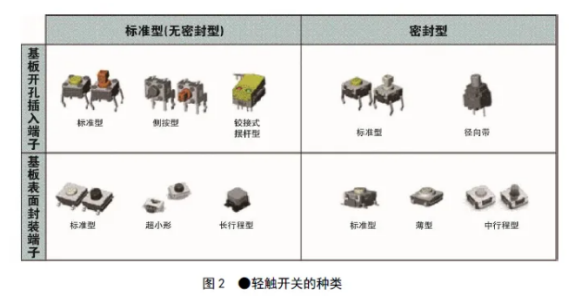 輕觸開關首先可以分為標準型(無密封型)和密封型。和微動開關一樣,密封型輕觸開關采取了防水、防塵措施,在環境惡劣的場所也能使用。其次,端子形狀可以分為兩種,一種是可以將端子插入印刷基板上的孔中的基板開孔插入端子,另一種是可以焊接在基板表面的基板表面封裝端子,還有根據用途加工成特殊形狀及規格的產品,比如從側面進行操作的側按型、操作行程較長的長行程型、外形只有米粒大小的超小型等等(圖2)。
