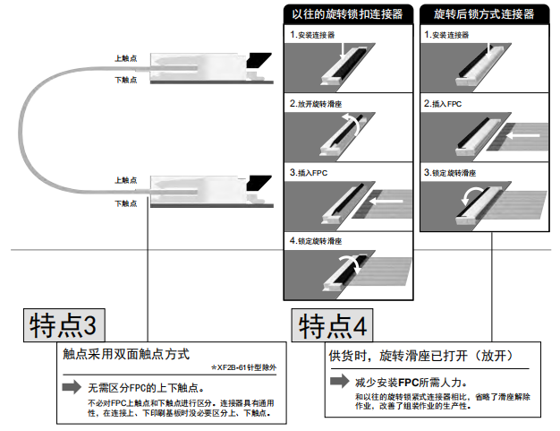 在移動(dòng)終端、便攜設(shè)備等領(lǐng)域高速發(fā)展的背景下,產(chǎn)品市場已經(jīng)越來越趨向于小型化。同時(shí),功能模塊的高度集中和傳輸信號(hào)的日益增多,迫切需要端子間距更小、更薄、更輕便的連接解決方案。歐姆龍推出FPC/FFC連接器XF3M,幫助您解決小型化需求。采用旋轉(zhuǎn)反鎖方式,輕松操作,減少工時(shí)。而且產(chǎn)品種類豐富,為您提供更多選擇。