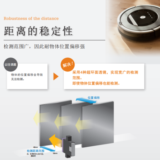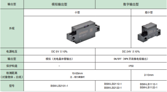 歐姆龍限定反射傳感器B5W-LB系列檢測范圍廣,因此耐物體位置偏移強,不易受外部干擾影響的設計。備有模擬電壓輸出和數字輸出兩種輸出模式。