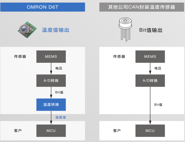 MEMS非接觸溫度傳感器采用歐姆龍自行設計的MEMS技術,將熱電堆元件和ASIC封裝在一起,實現超小型化。