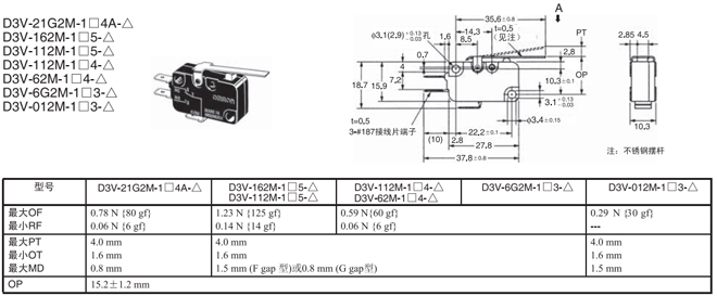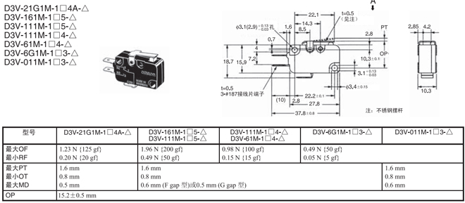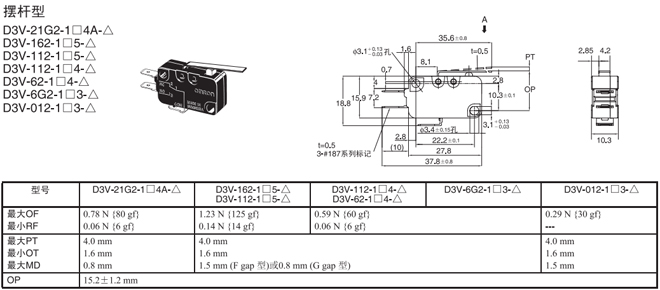 | 短擺桿型 | 內(nèi)部安裝 | 1.23N {125gf} | D3V-21G1-1□4A-△ | D3V-21G1-2□4A-△ | D3V-21G1-3□4A-△ |
