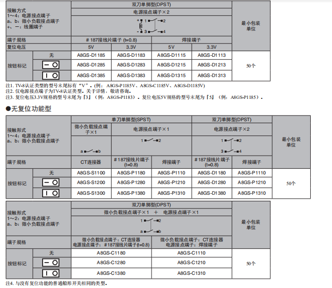 A8GS 遠(yuǎn)程復(fù)位 船形開關(guān) 帶復(fù)位功能船形開關(guān) 利用基于外部信號(hào)的 “復(fù)位功能”關(guān)閉電源開關(guān),設(shè)備的待機(jī)功率為零。 適用于浪涌較大的負(fù)載的電源ON/OFF。適用于TV-8(浪涌特性117A)。 備有適用于微小負(fù)載領(lǐng)域的接點(diǎn)構(gòu)造種類。 備有可同時(shí)ON/OFF微小負(fù)載領(lǐng)域、高負(fù)載領(lǐng)域的2極規(guī)格種類。 接點(diǎn)間隙大于3mm。 取得UL、cUL標(biāo)準(zhǔn)認(rèn)證,并符合EN標(biāo)準(zhǔn)。