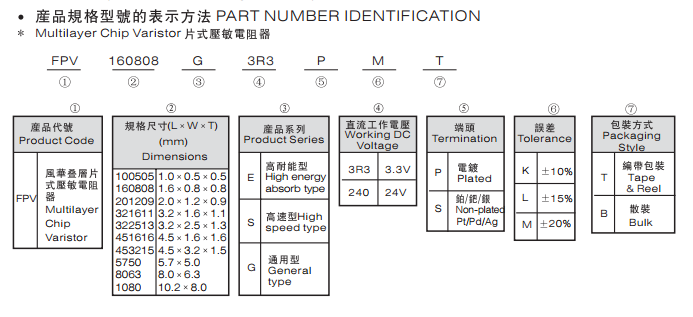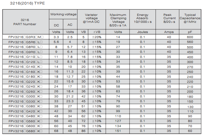特征: 1、疊層片式陶瓷結構。 2、無引線。 3、溫度范圍:-55℃~+125 ℃。 4、工作電壓范圍V w(dc)=3.3~ 615V。 5、具有雙向限制特性,適合ESD保護。 6、漏電流非常小。 7、寄生電感小、響應速度快(響應時間少于0.5ns)。 8、優良的溫度系數。 9、良好的焊接性能(端電極為三層電鍍)。 應用: 1、防止過電壓:當施加的電壓升高到壓敏電壓時,壓敏電阻器的電流急劇上升,被保護設備的浪涌電壓迅速減小,從而使裝有壓敏電阻器的設備抗浪涌噪聲能力達到相應要求。壓敏